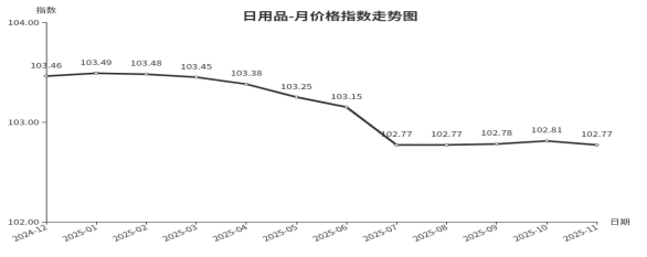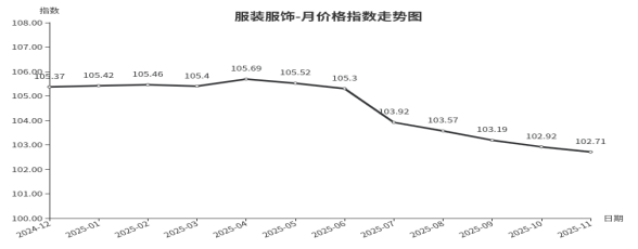 本月,服装服饰类月价格指数收于102.71点,环比下跌0.21点。二级分类中,服装类、服饰类同步下行,分别下跌0.43点和0.12点。11月市场呈现“先扬后抑”的阶段性特征:上半月受大幅降温影响,羽绒服、棉衣等冬季产品需求释放,零售和批发两旺,带动销售均价上涨;但“双十一”促销提前透支消费需求,下旬市场回归平淡,童装、女装销量下滑明显,零售端表现乏力,市场以批发为主,拉低整体销售均价。