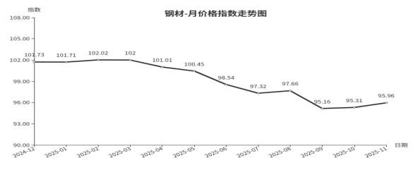 本月,钢材类月价格指数收于95.96点,环比上涨0.65点,三级分类中,建筑钢材类、型材类、板材类、管材类全部出现上涨。11月份,钢材价格震荡运行,月初价格涨幅明显,中下旬价格维持平稳。与上月相比,11月钢材价格小幅上涨,上游原材料价格上涨,成本端支撑加强,市场钢材价格小幅跟涨。业户多持买涨不买跌思维,价格上涨带动市场销售量增加,下游经销商进货积极性提高,但受终端需求低迷影响,销售量增长幅度有限。