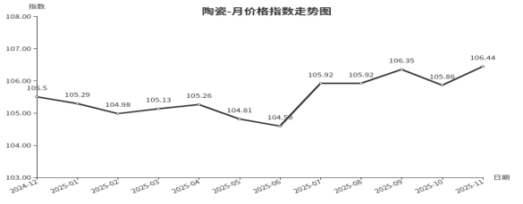 本月,陶瓷类月价格指数收于106.44点,环比上涨0.58点。从指数构成要素看,陶瓷洁具、建筑陶瓷月价格指数环比小幅上涨,分别上涨2.41点、0.06点;日用陶瓷月价格指数环比下跌。随着季节转换气温降低,家工装行业施工减少,座便器、陶瓷面盆、瓷砖等产品步入季节性销售淡季,当前市场销售以散户零售为主,带动产品平均销售价格上涨。近期婚庆活动增加,餐饮业逐步转旺,带动日用陶瓷市场需求释放,部分产品销售价格小幅下调,中下游经销商积极备货,陶瓷盘、陶瓷碗等陶瓷餐具成交量增加,销售额环比上涨。