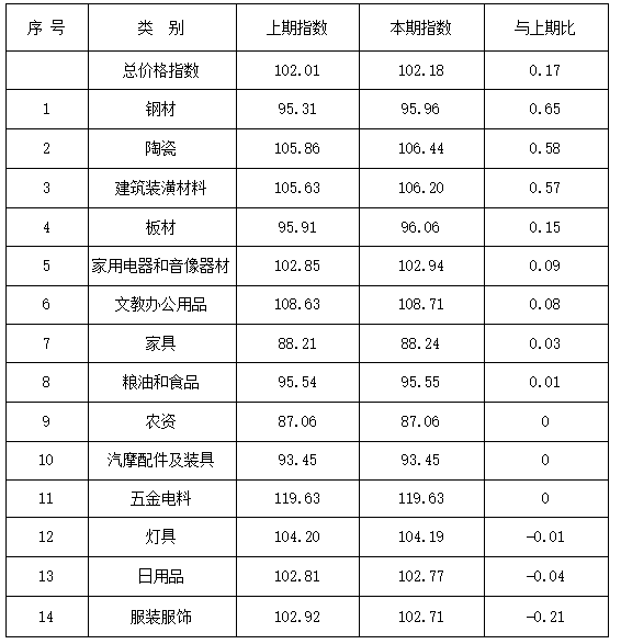 在14类商品月价格指数中,上涨的8类、持平的3类、下跌的3类。其中,上涨前2位的是:钢材类、陶瓷类;下跌前2位的是:服装服饰类、日用品类。涨跌幅前2的情况如下: